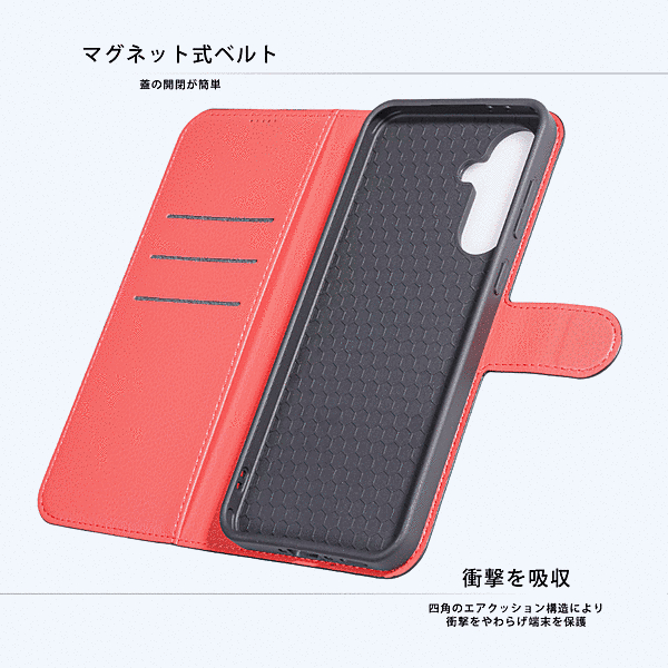 上品な質感のPUレザーを使用し、手になじみやすく使い心地も快適。内側にはカードポケット付きで、お出かけにも便利。開閉はマグネット式でスムーズに使えます。大切なスマホを画面までしっかり包み込んで守ってくれる、機能性とデザイン性を兼ね備えたレザーケースです。
