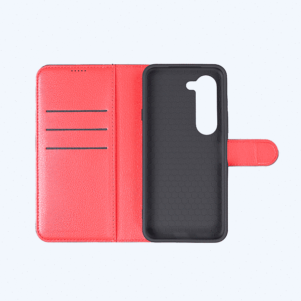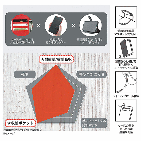 衝撃に強く、使いやすい。ケースの蓋を閉じたまま通話が可能。マグネット式なのでケースの開閉が簡単に行える。アクセサリーなどがつけられるストラップホール付き。衝撃をやわらげる四つ角のエアクッション構造