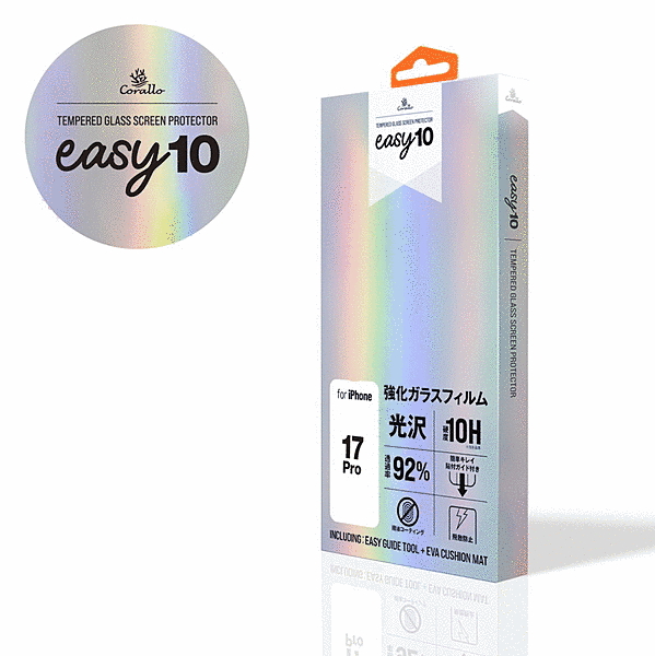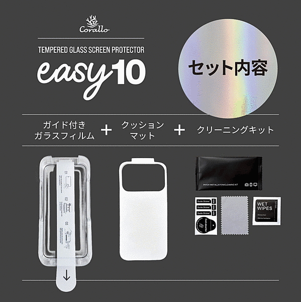 「貼り付け簡単 3ステップ」(1)スマホをクッションマットに載せ、きれいにする。(2)ガラスフィルム付きガイドをスマホに被せる。(3)シートをゆっくり引く。「硬度10H」硬度10H のアルミノシリケートガラスを使用しているので、ナイフ等の鋭利なものでも簡単に傷がつきません。「透過率92%以上」透過率が高く、品質の高いガラスフィルムを使用しています。「指紋がつきにくい」指紋や皮脂の汚れがつきにくく、簡単に拭き取ることができます。「スムーズな操作感」指すべりが良く、文字入力やゲームも快適に操作できます。