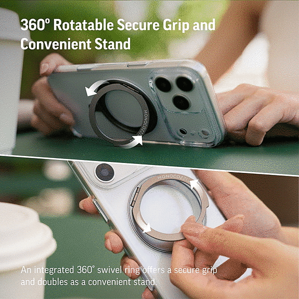 「クリアな美しさ」本体デザインを楽しめるように、クリスタルのように透き通ったPCを使用。黄ばみにくく美しさが続きます。「360°回転のグリップスタンド」一体型のリングは360度回転可能で、持ちやすさも動画視聴もスマートにサポートします。「耐衝撃」厚さ約2.8mmの薄型設計でありながら、約2.6mの落下試験をクリアした耐衝撃ケースです。「マグネット搭載」Apple純正MagSafe充電器や対応アクセサリが付けられ、規格に準じたワイヤレス充電が可能です。「液晶・背面カメラ保護」液晶やカメラレンズが直接触れないフチ高設計。また、カメラコントロールカバーにより、傷や埃から守りつつ、スムーズな操作性もキープします。