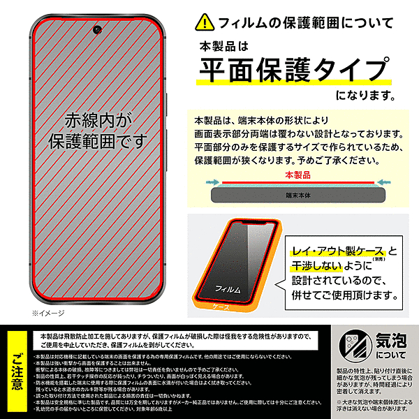 PETフィルムの約5倍の硬度で傷付きにくい。ブルーライトを約40%軽減、画面が綺麗に見える。防汚コーティングで指紋防止効果。レイ・アウト製ケース(別売)と一緒に使用しても干渉しない設計。
