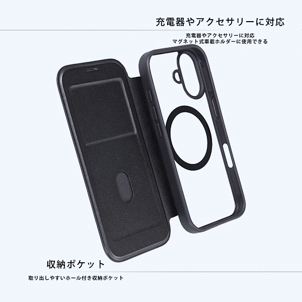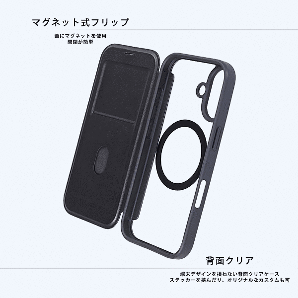 透明な背面パネルで端末のデザインを活かせる、マグネット開閉タイプのフリップケース。