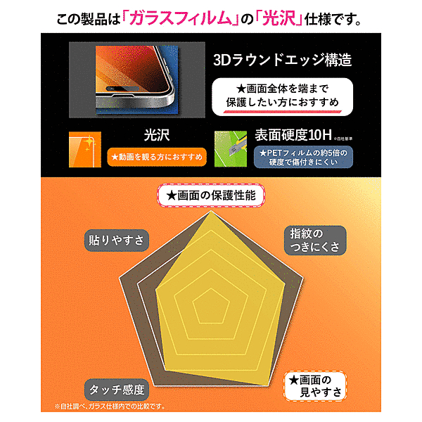 PETフィルムの約5倍の硬度で傷付きにくい。美しい光沢仕様で、高画質な写真や動画が綺麗に見える。画面全体を保護し衝撃や傷から守る。