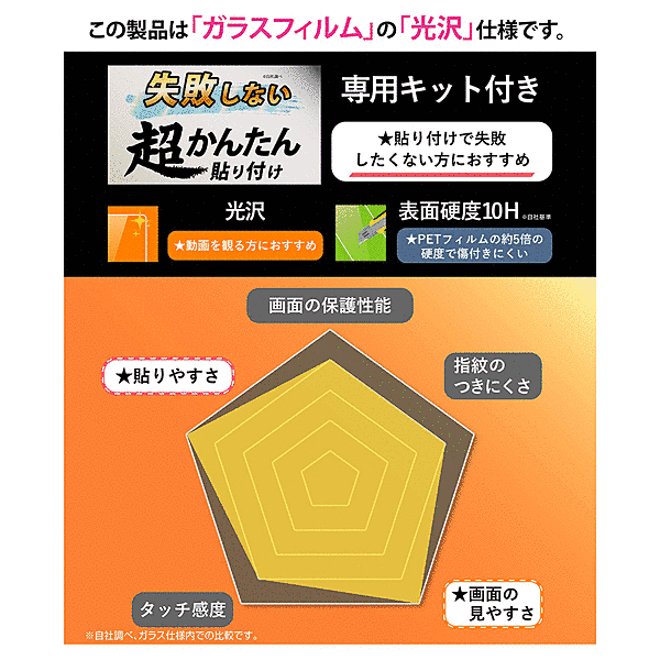 ガラスは表面硬度10Hの光沢仕様で、画面の美しさと操作性もそのまま楽しめます。