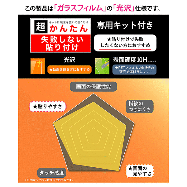 高い透明感で画面の美しさをそのまま楽しめる光沢タイプのガラスフィルム。
