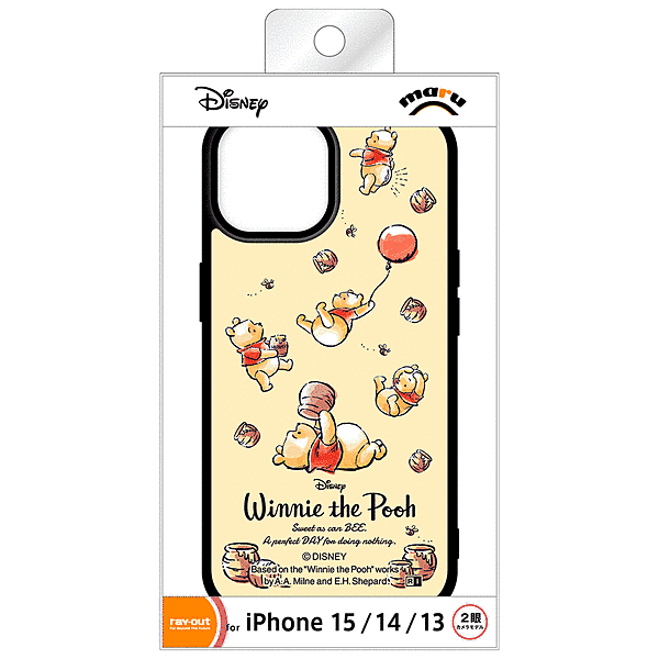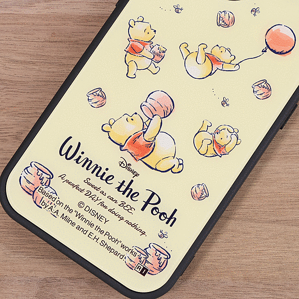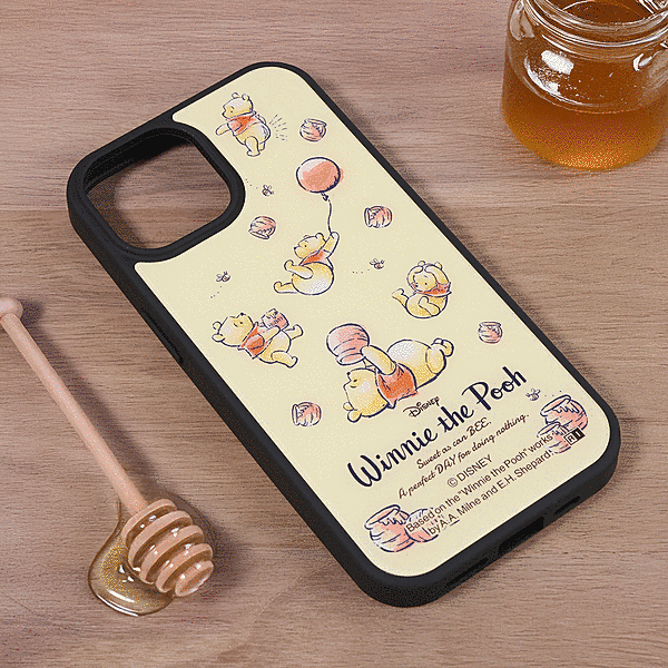 表面硬度2Hの背面に、プーさんとはちみつの壺や風船などプーさんらしいアイテムを散りばめて心が和むようなデザインをあしらったハイブリッドケース。