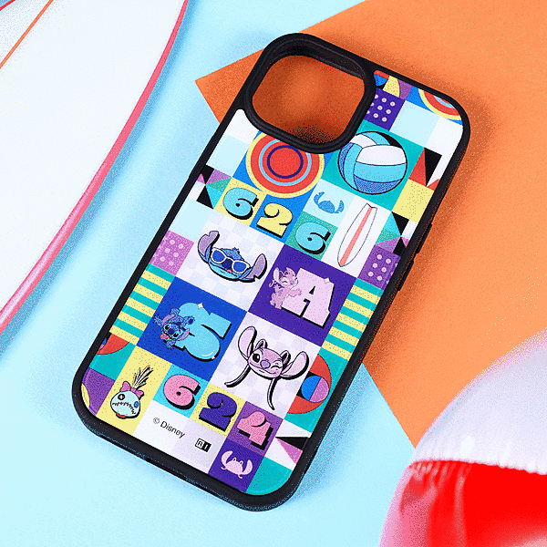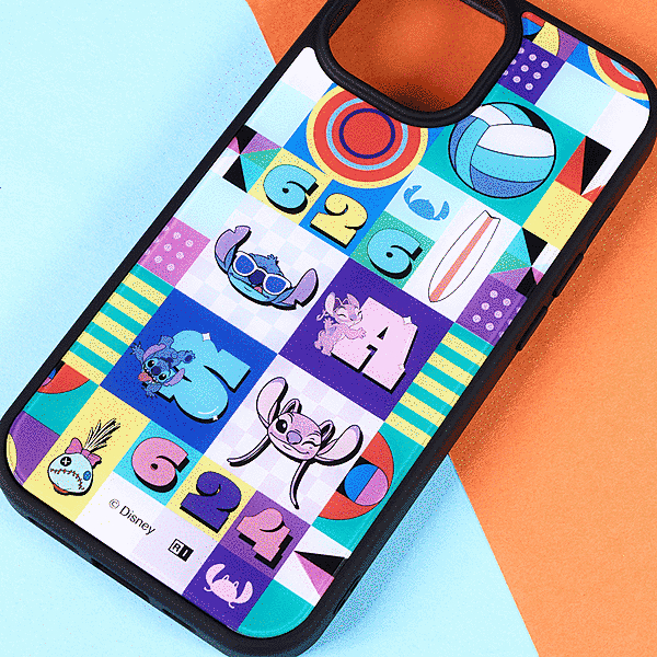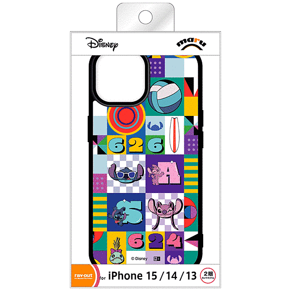 表面硬度2Hの背面に、スティッチがのんびり南国で楽しんでいる様子を表現したデザインをあしらったハイブリッドケース。