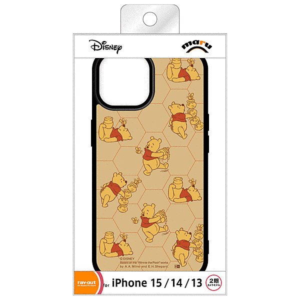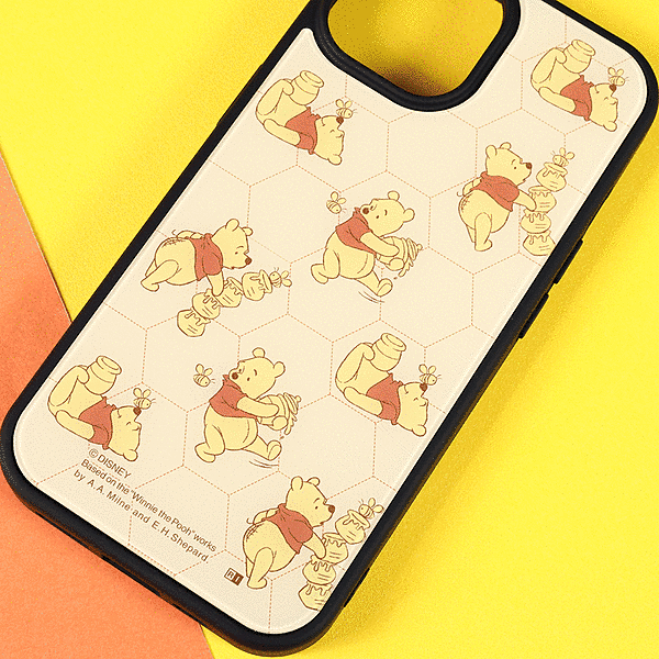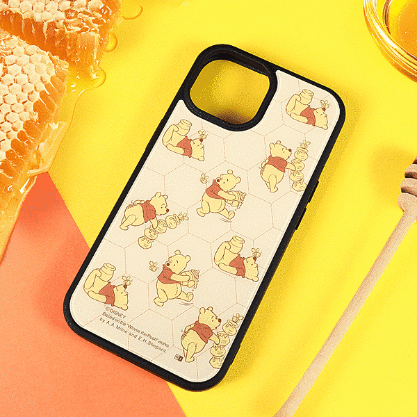 表面硬度2Hの背面に、はちみつが大好きなプーと、はちみつを守りたいハチを散りばめデザインをあしらったハイブリッドケース。