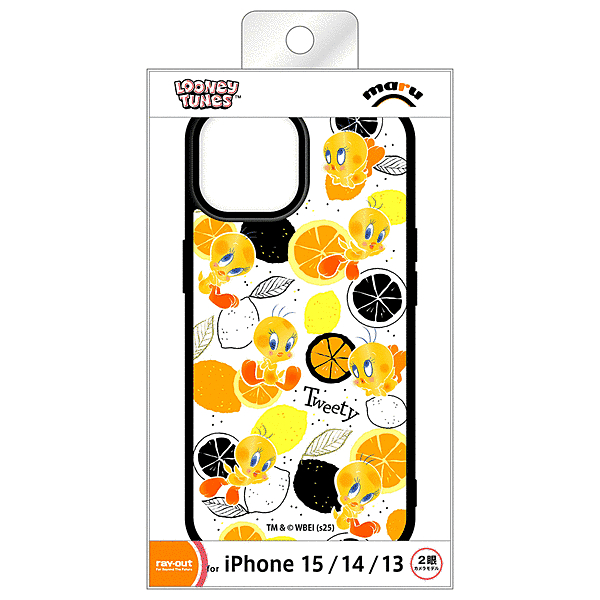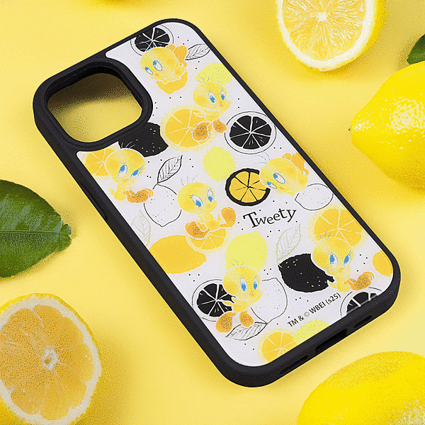 表面硬度2Hの背面に、トゥイーティーがちりばめられた、キュートな総柄デザインをあしらったハイブリッドケース。