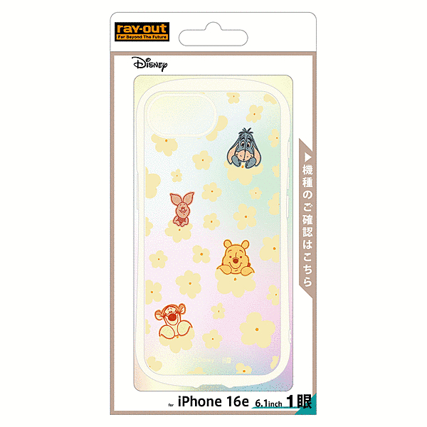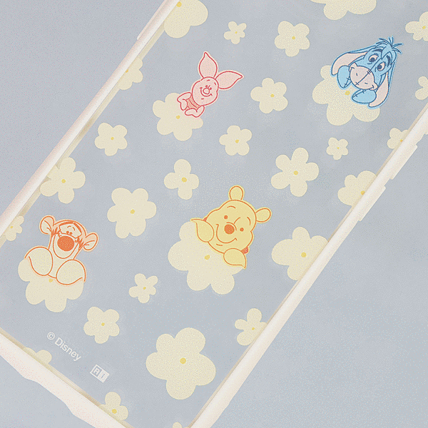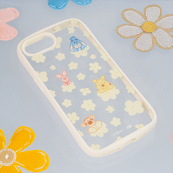 プーと仲間達が花に乗ってこちらを覗いているような可愛らしいデザインで、衝撃に強く、フィット感にも優れたハイブリッドケース。