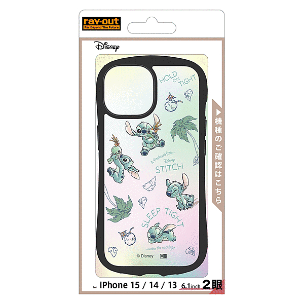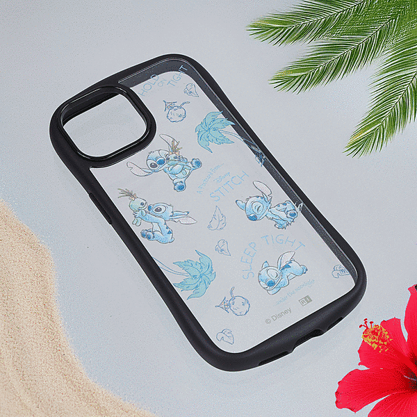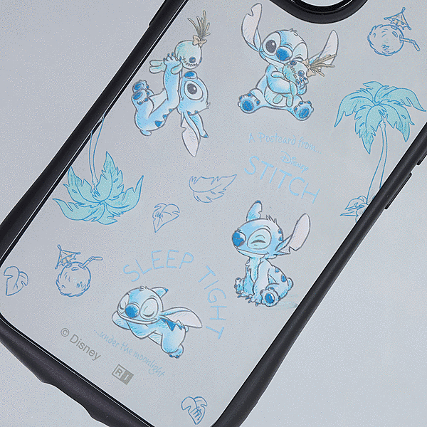 スティッチがのんびり南国で楽しんでいる様子を表現したデザインと、衝撃に強い安心感を兼ね備えたハイブリッドケース。