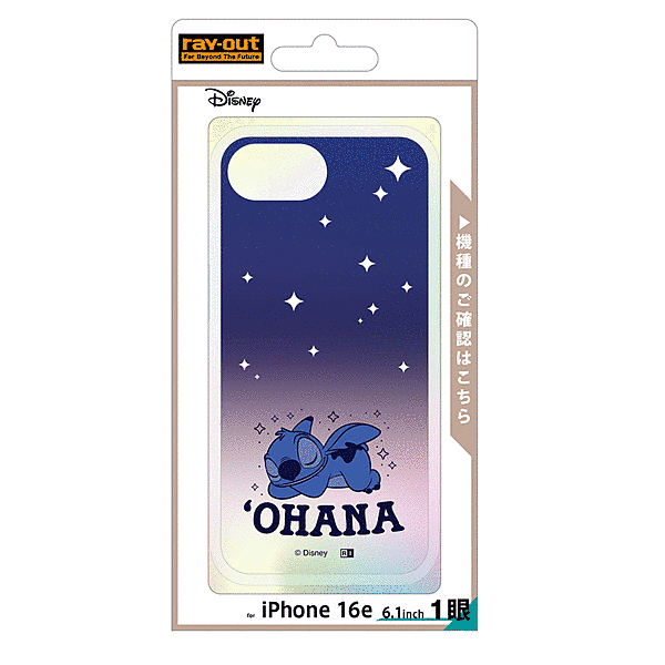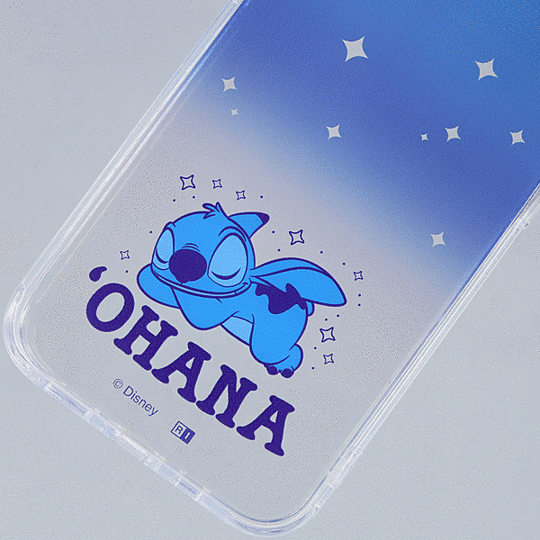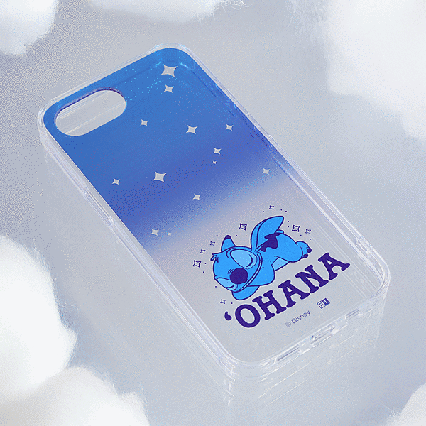 ビーチハウスの屋上にある展望台から見える星空のイメージと眠り姿のスティッチのデザインが楽しめる透明感のあるハイブリッドケース。