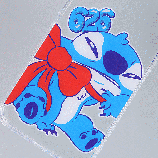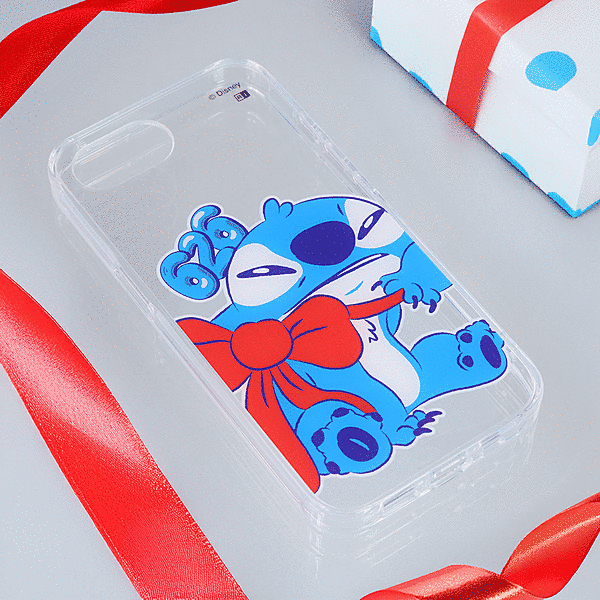 リボンをつけた可愛いらしいスティッチのデザインが楽しめる透明感のあるハイブリッドケース。