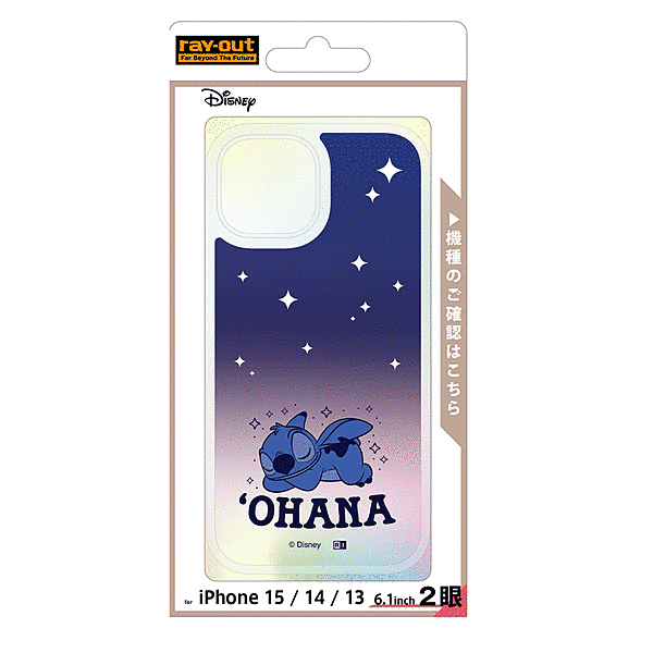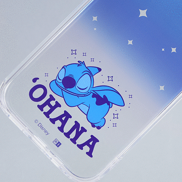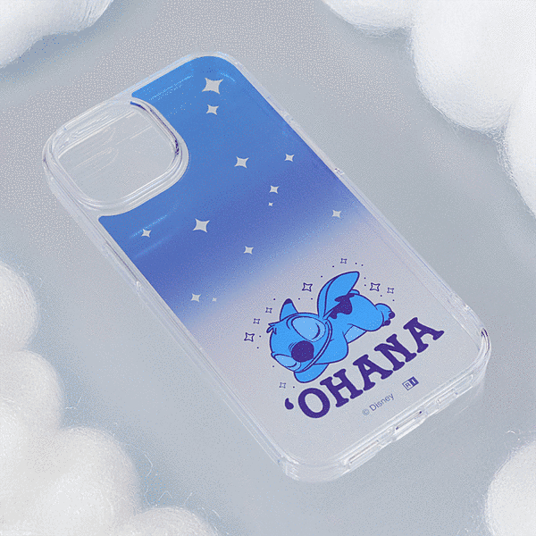 ビーチハウスの屋上にある展望台から見える星空のイメージと眠り姿のスティッチのデザインが楽しめる透明感のあるハイブリッドケース。