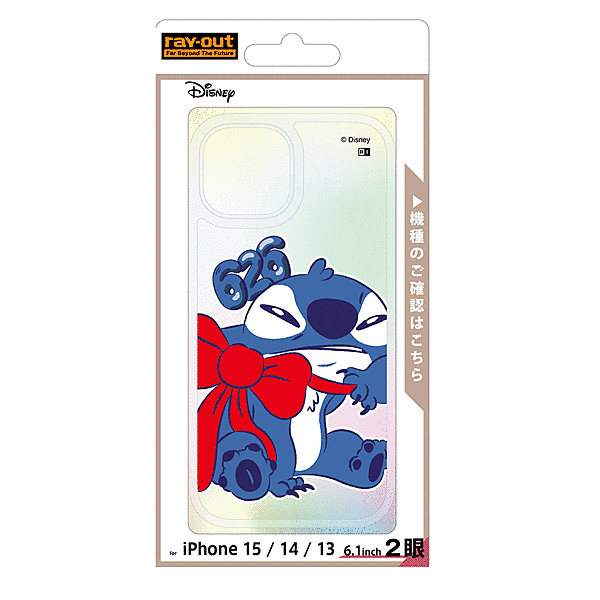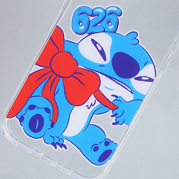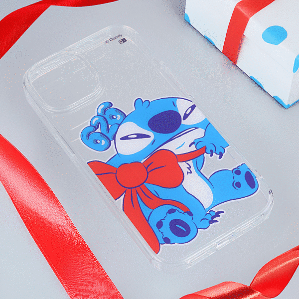 リボンをつけた可愛いらしいスティッチのデザインが楽しめる透明感のあるハイブリッドケース。