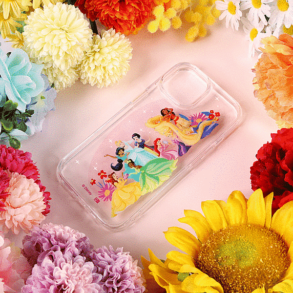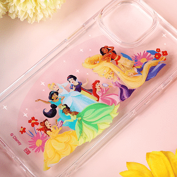 様々な作品のプリンセスが集合したアートを使用した可愛らしいデザインが楽しめる透明感のあるハイブリッドケース。