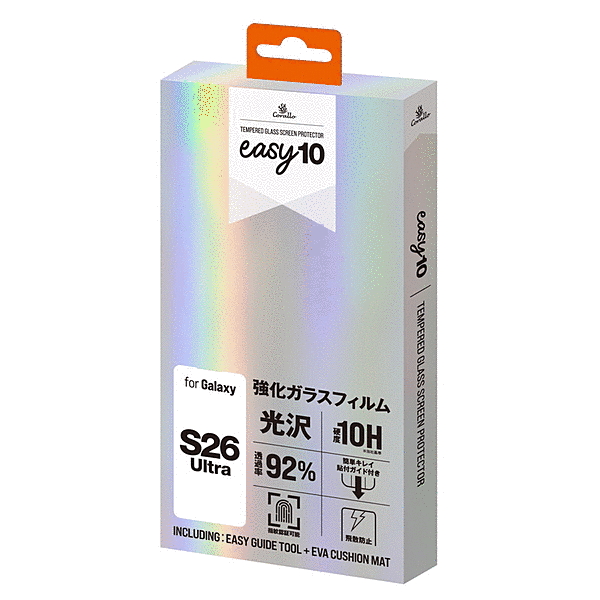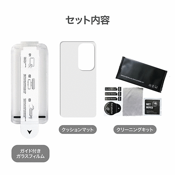 「貼り付け簡単 3ステップ」(1)スマホをクッションマットに載せ、きれいにする。(2)ガラスフィルム付きガイドをスマホに被せる。(3)シートをゆっくり引く。「硬度10H」硬度10H のアルミノシリケートガラスを使用しているので、ナイフ等の鋭利なものでも簡単に傷がつきません。「透過率92%以上」透過率が高く、品質の高いガラスフィルムを使用しています。「指紋がつきにくい」指紋や皮脂の汚れがつきにくく、簡単に拭き取ることができます。「スムーズな操作感」指すべりが良く、文字入力やゲームも快適に操作できます。