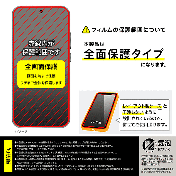 誰でも簡単に貼り付けができる貼り付けキット付きで失敗しない。PETフィルムの約5倍の硬度で傷付きにくい。美しい光沢仕様で、高画質な写真や動画が綺麗に見える。防汚コーティングで指紋防止効果。レイ・アウト製ケース(別売)と一緒に使用しても干渉しない設計。全画面保護設計