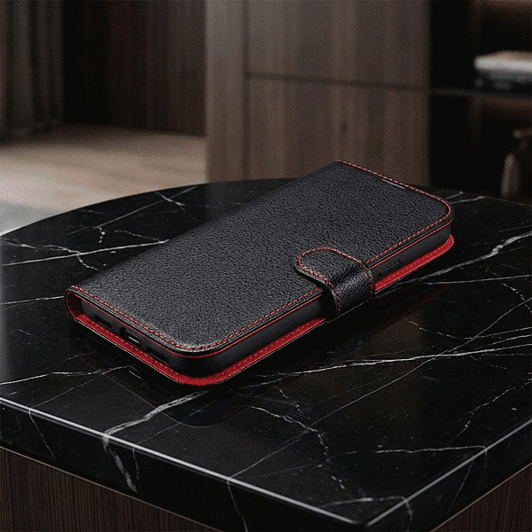 手帳型レザーケース シンプル マグネット ブラック/レッド