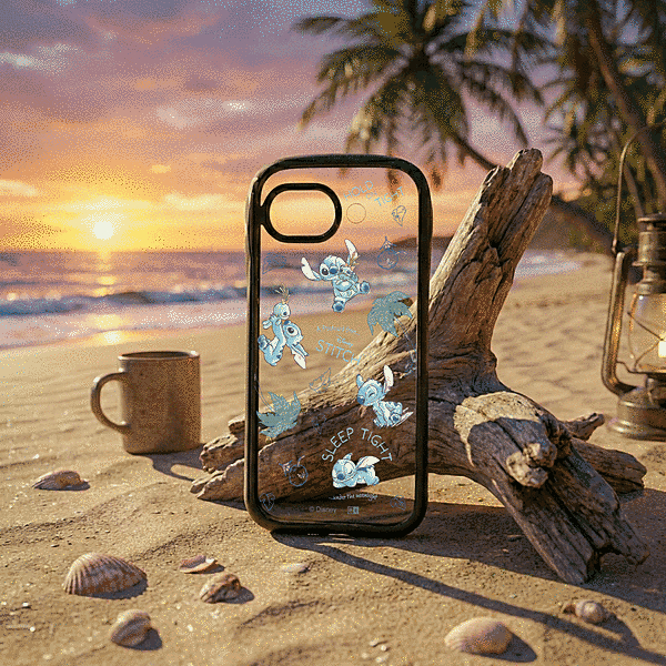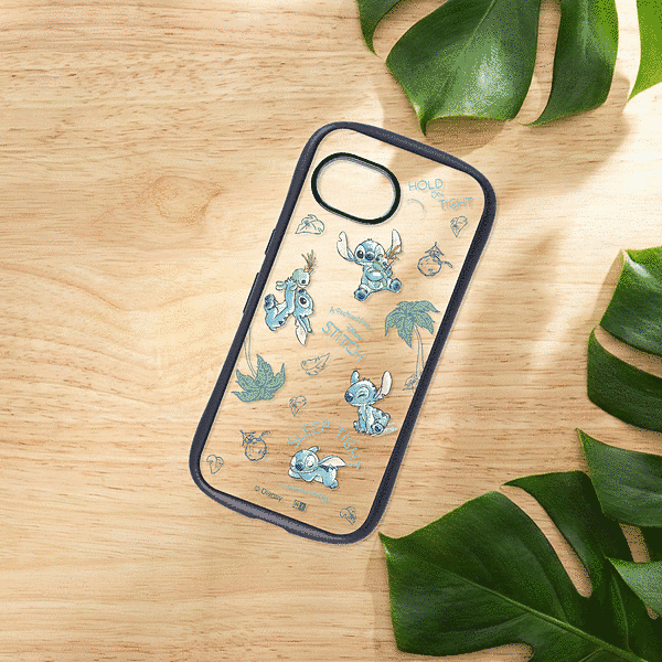 スティッチがのんびり南国で楽しんでいる様子を表現したデザインと、衝撃に強い安心感を兼ね備えたハイブリッドケース。