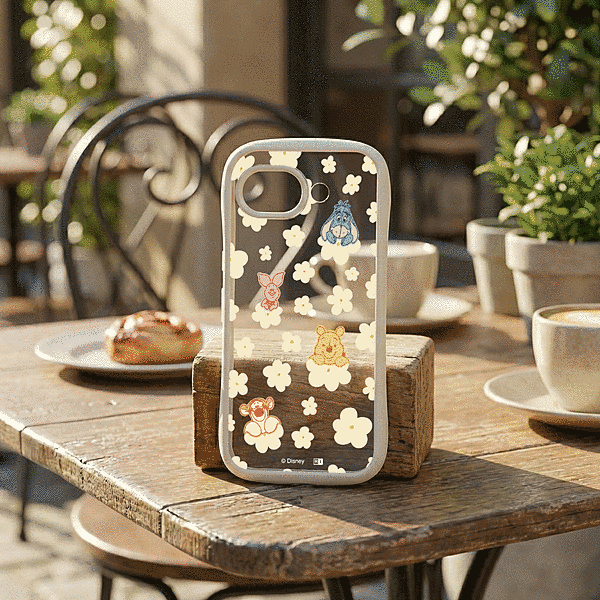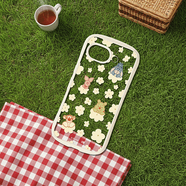 プーと仲間達が花に乗ってこちらを覗いているような可愛らしいデザインで、衝撃に強く、フィット感にも優れたハイブリッドケース。