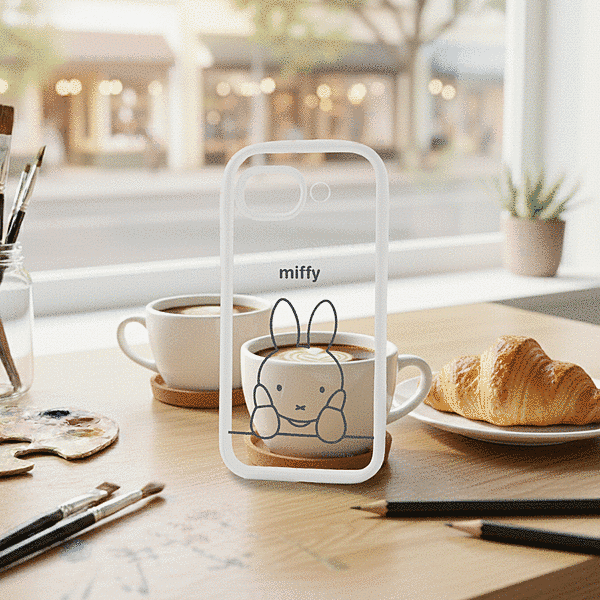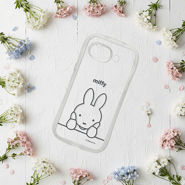ほおづえをついている可愛いミッフィーが描かれたデザインと、衝撃に強い安心感を兼ね備えたハイブリッドケース。