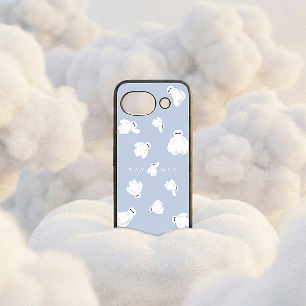 表面硬度2Hの背面に、かわいいベイマックスがふわふわ浮かんでいるようなデザインをあしらったハイブリッドケース。