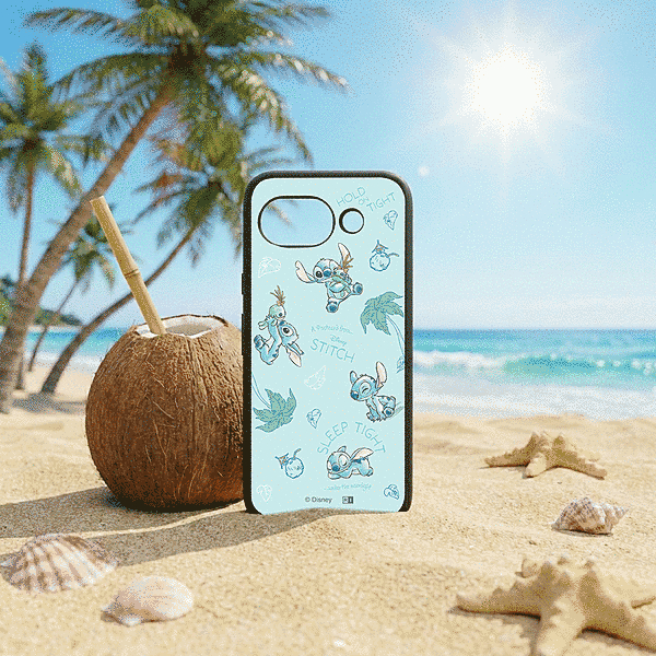 表面硬度2Hの背面に、スティッチがのんびり南国で楽しんでいる様子を表現したデザインをあしらったハイブリッドケース。