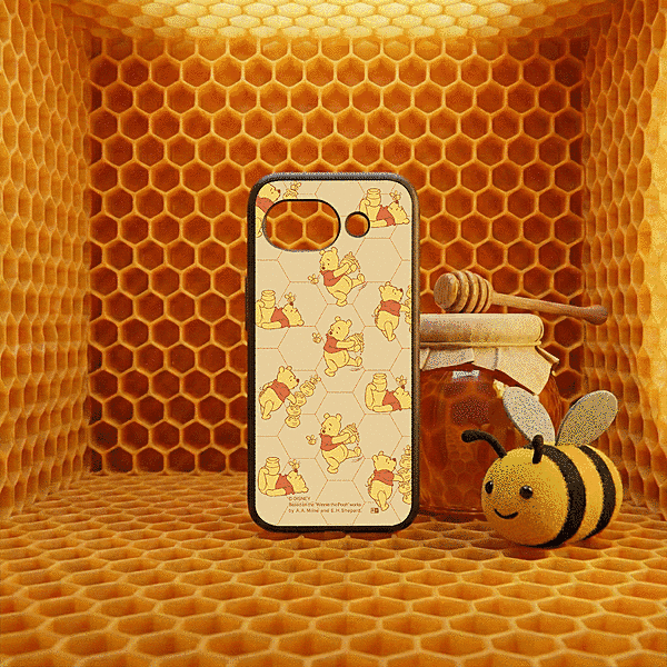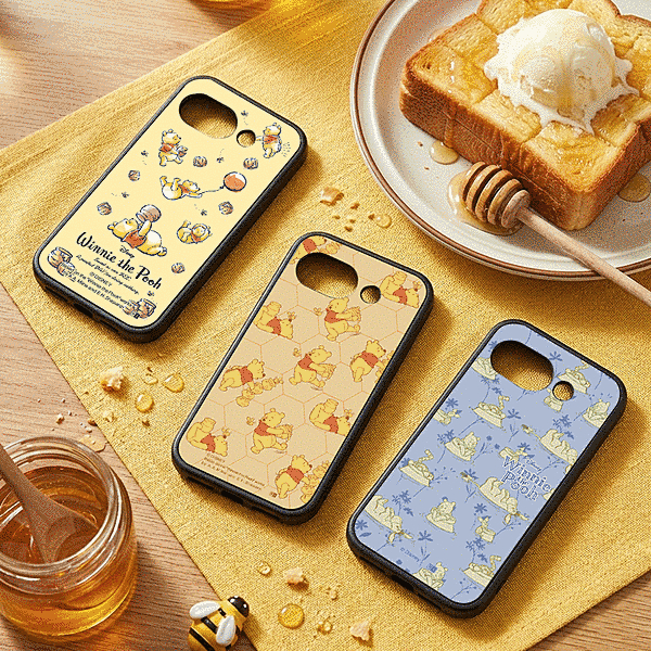 表面硬度2Hの背面に、はちみつが大好きなプーと、はちみつを守りたいハチを散りばめデザインをあしらったハイブリッドケース。