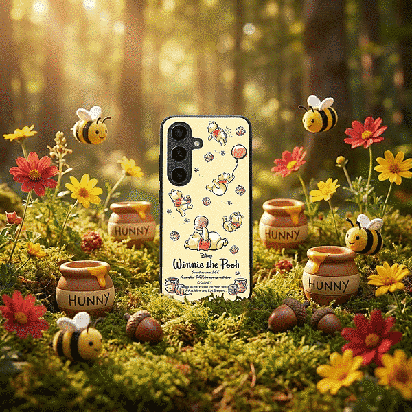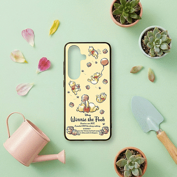 表面硬度2Hの背面に、プーさんとはちみつの壺や風船などプーさんらしいアイテムを散りばめて心が和むようなデザインをあしらったハイブリッドケース。