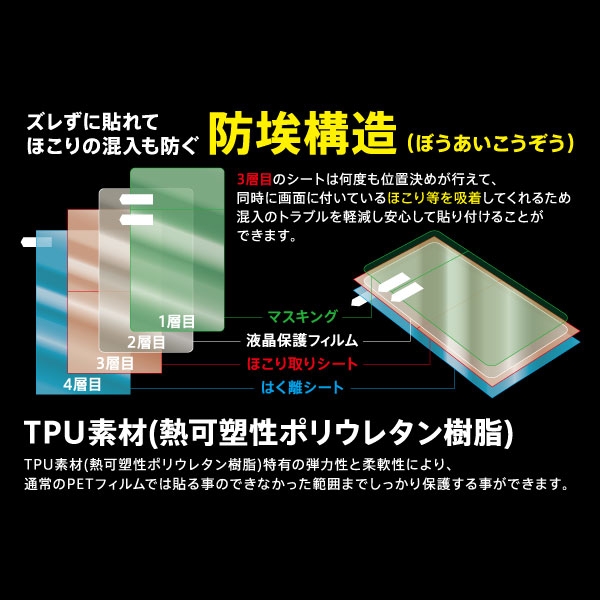 ズレずに貼れてほこりの混入も防ぐ229gの鉄球を130cmの高さから落としても割れない特有の弾力性と柔軟性により、通常のPETフィルムでは貼る事のできなかった画面の端までしっかり保護