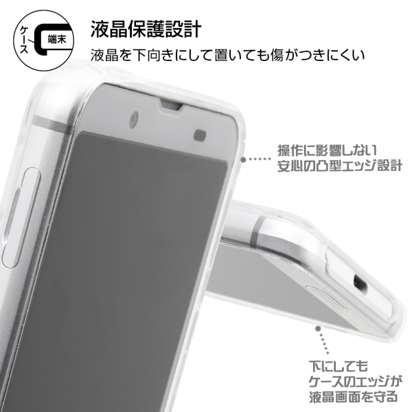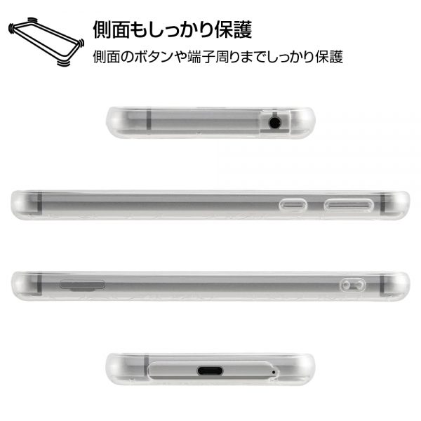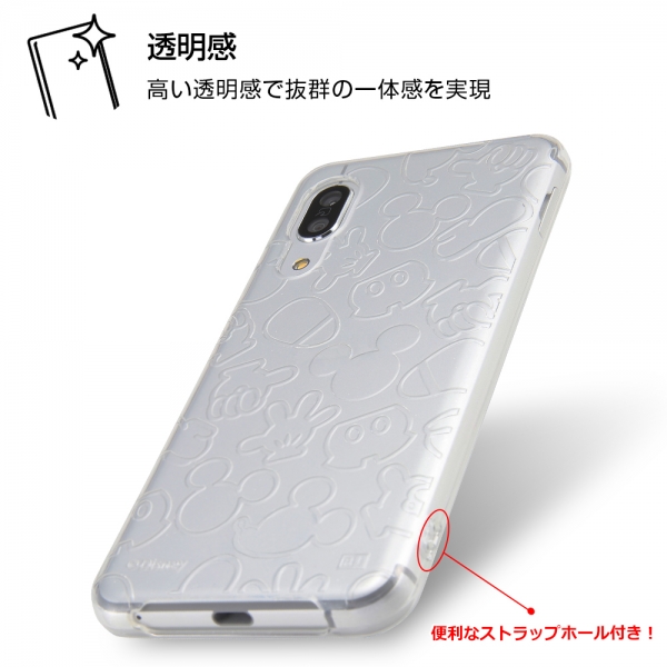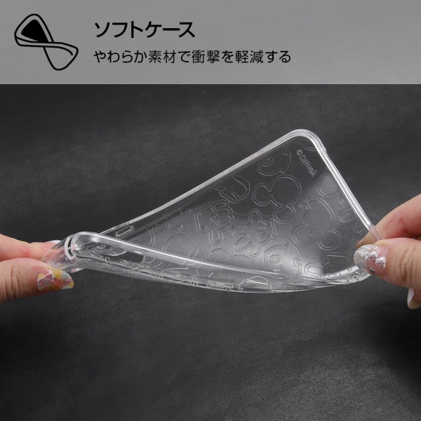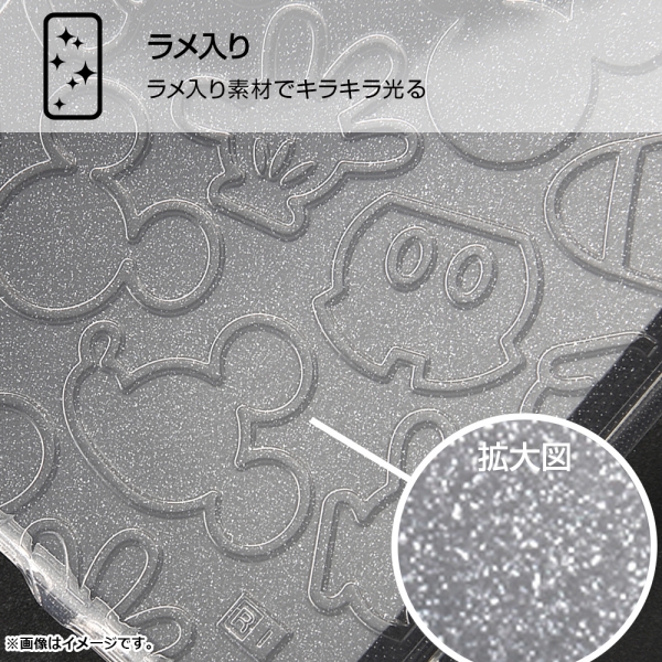 ミッキーマウスのアイコンが散りばめられた可愛いラメ入りケース。高い透明感で抜群の一体感を実現。衝撃をやわらげる柔らか素材。ボタンや端子周りまで保護。