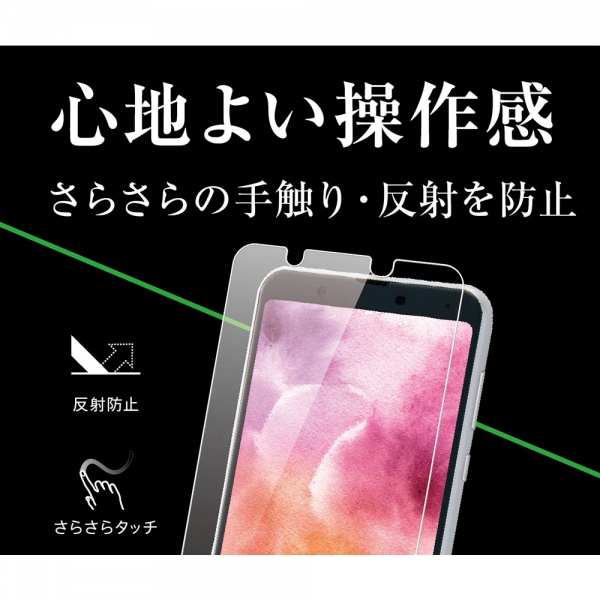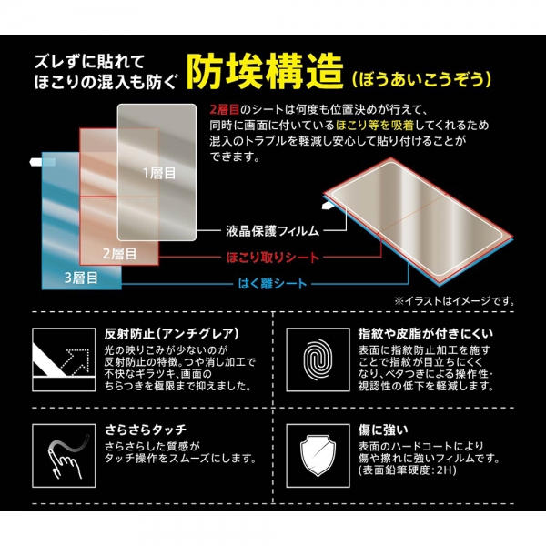 光の映りこみが少ないのが反射防止の特徴。つや消し加工で不快なギラツキ、画面のちらつきを極限まで抑えました。さらさらした質感がタッチ操作をスムーズにします。何度も位置決めが行えて、同時に画面に付いているほこり等を吸着するため、ほこり混入を軽減し安心して貼り付けることができます。表面のハードコートにより傷や擦れに強いフィルムです。(表面鉛筆硬度:2H)