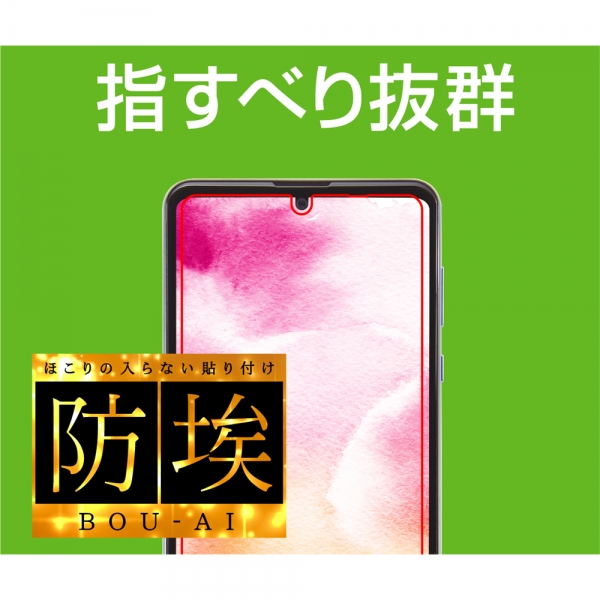 光の映りこみが少ないのが反射防止の特徴。つや消し加工で不快なギラツキ、画面のちらつきを極限まで抑えました。さらさらした質感がタッチ操作をスムーズにします。何度も位置決めが行えて、同時に画面に付いているほこり等を吸着するため、ほこり混入を軽減し安心して貼り付けることができます。表面のハードコートにより傷や擦れに強いフィルムです。(表面鉛筆硬度:2H)