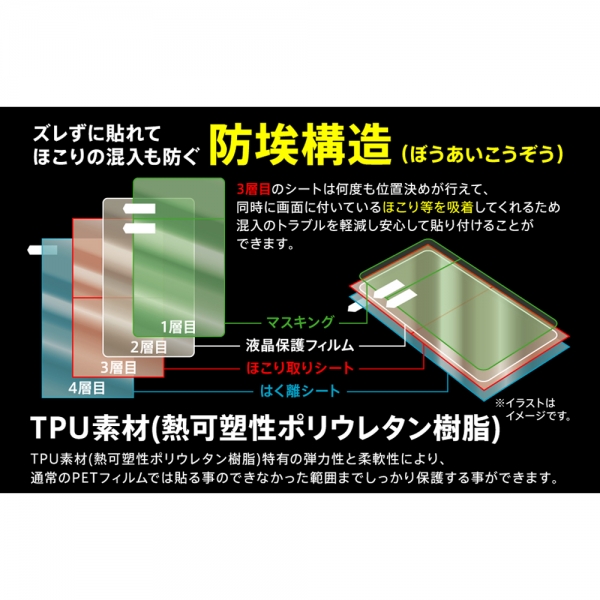 何度も位置決めが行えて、同時に画面に付いているほこり等を吸着するため、ほこり混入を軽減し安心して貼り付けることができます。229gの鉄球を130cmの高さから落としても割れない特有の弾力性と柔軟性により、通常のPETフィルムでは貼る事のできなかった画面の端までしっかり保護ヘイズ(光散乱)を抑えることで画面が白くボケることを抑えくっきり鮮やか。