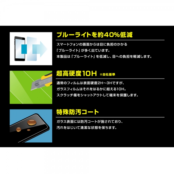 スマートフォンのLCDパネルからは目に負担のかかる「ブルーライト」が多く出ています。本製品は「ブルーライト」を低減し、目への負担を軽減します。通常のフィルムは表面硬度2H?3H。それをはるかに超える10H。
