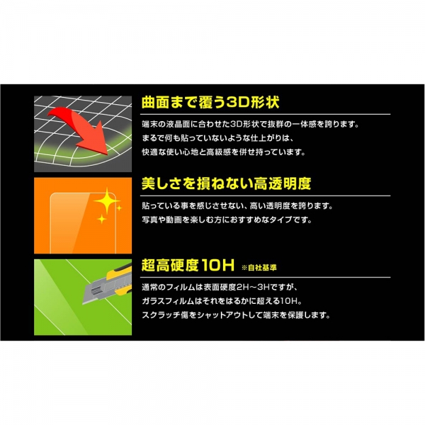 端末の液晶面に合わせた3D形状によりまるで貼っていないような自然な使い心地です。通常のフィルムは表面硬度2H?3H。それをはるかに超える10H。