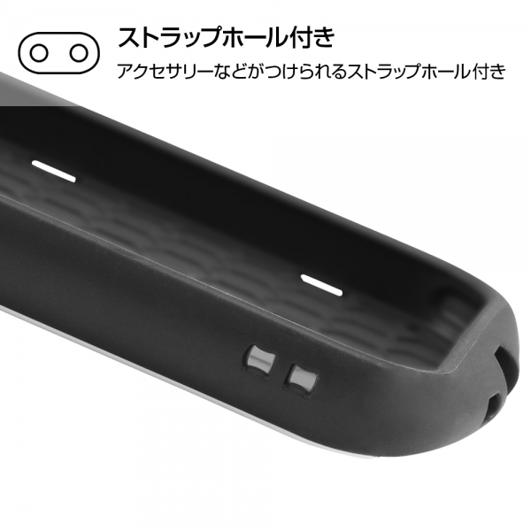 ケース上部と下部は衝撃をやわらげるエアクッション構造。衝撃をやわらげるTPU素材と鉛筆硬度3Hで傷に強いポリカーボネイト素材。ケース内側はハニカム構造なので衝撃から端末を守る。デザインを損ねない側面のストラップホール。