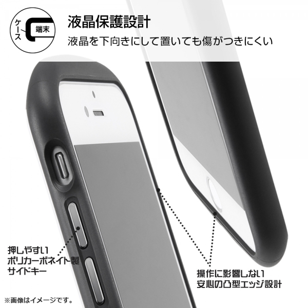 ケース上部と下部は衝撃をやわらげるエアクッション構造。衝撃をやわらげるTPU素材と鉛筆硬度3Hで傷に強いポリカーボネイト素材。ケース内側はハニカム構造なので衝撃から端末を守る。デザインを損ねない側面のストラップホール。