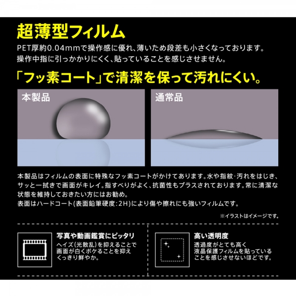 操作中指に引っかかりにくく、貼っていることを感じさせません。本製品はフィルムの表面に特殊なフッ素コートがかけてあります。水や指紋・汚れをはじき、サッと一拭きで画面がキレイ。指すべりがよく、抗菌性もプラスされております。常に清潔な状態を維持しておきたい方にはお勧めのフィルムです。