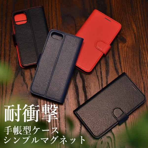 耐衝撃 手帳型レザーケース シンプル マグネット/ブラック/レッド