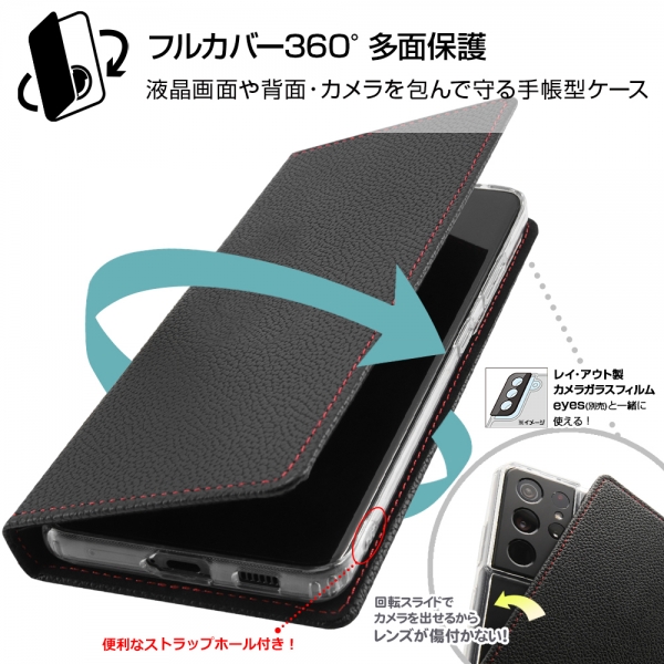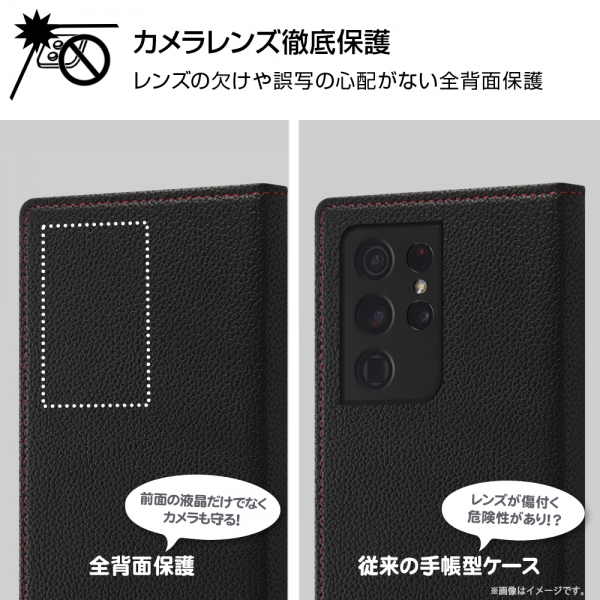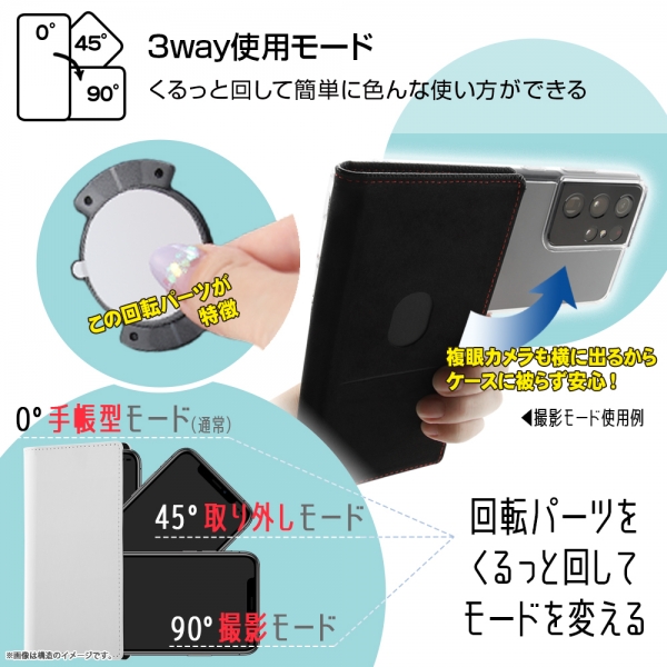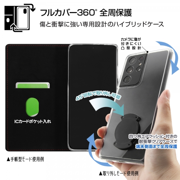 カメラを徹底保護。カメラ穴がないため傷が付きにくく、誤撮影の心配もなし。内側のケースは傷に強く衝撃吸収に優れたハイブリッド素材。くるっと回して簡単着脱。ICカードポケット付き。