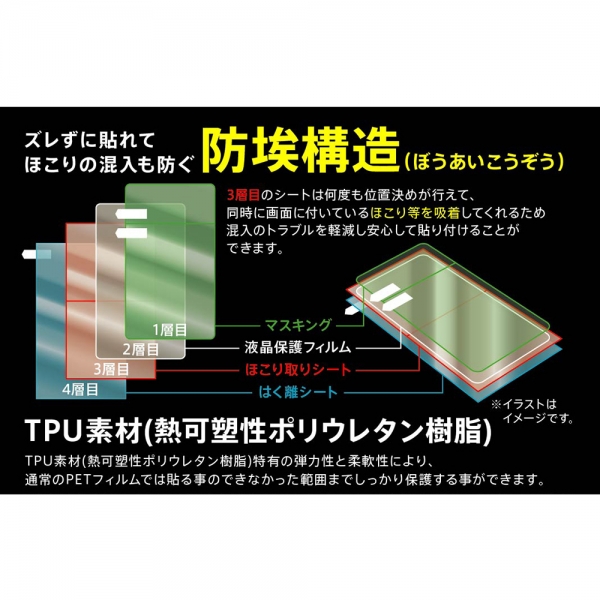 目の疲労軽減。何度も位置決めが行えて、同時に画面に付いているほこり等を吸着するため、ほこり混入を軽減し安心して貼り付けることができます。229gの鉄球を130cmの高さから落としても割れない。特有の弾力性と柔軟性により、通常のPETフィルムでは貼る事のできなかった画面の端までしっかり保護。スマートフォンのLCDパネルからは目に負担のかかる「ブルーライト」が多く出ています。本製品は「ブルーライト」を低減し、目への負担を軽減します。