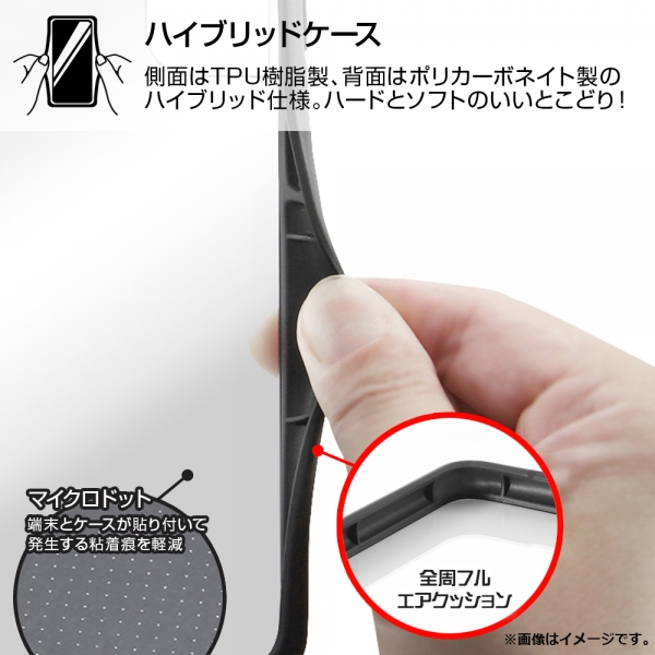 四つ角だけでなく、側面全周が耐衝撃構造。全周フルエアクッション。鉛筆硬度2Hで傷に強いポリカーボネイト素材。衝撃をやわらげるTPU素材。デザインを損ねない側面のストラップホール。
