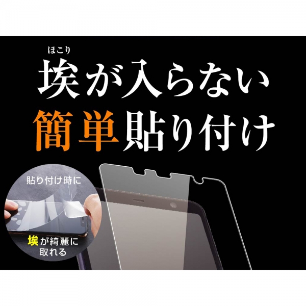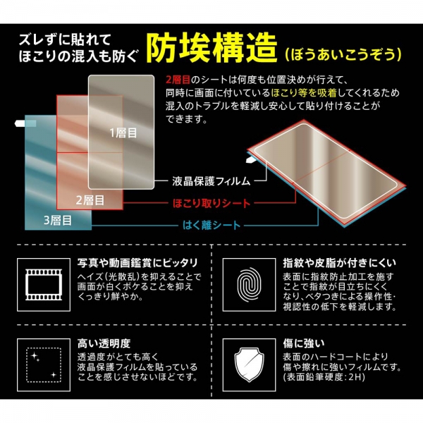 ズレずに貼れてほこりの混入も防ぐ防埃構造。ヘイズ(光散乱)を抑えることで画面が白くボケることを抑えくっきり鮮やか。透過度がとても高く液晶保護フィルムを貼っていることを感じさせないほどです。何度も位置決めが行えて、同時に画面に付いているほこり等を吸着するため、ほこり混入を軽減し安心して貼り付けることができます。表面のハードコートにより傷や擦れに強いフィルムです。(表面鉛筆硬度:2H)。