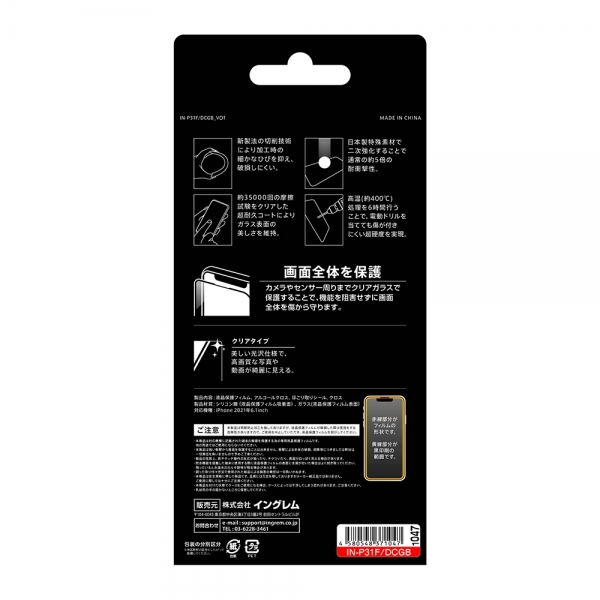 画面が綺麗に見える/クリアタイプ。新製法の切削技術により加工時の細かなひびを抑え破損しにくい。日本製特殊素材で二次強化することで通常の約5倍の耐衝撃性。約35000回の摩擦試験をクリアした超耐久コートによりガラス表面の美しさを維持。高温(約400℃)処理を6時間行うことで、電動ドリルを当てても傷が付きにくい超高度を実現。