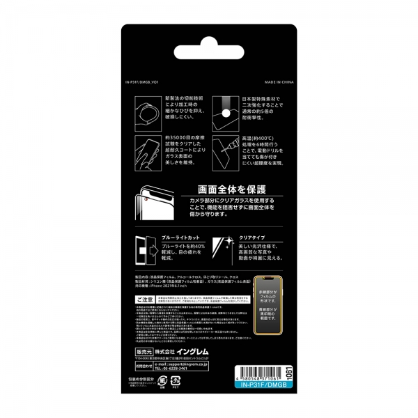 ブルーライトカット/クリアタイプ。新製法の切削技術により加工時の細かなひびを抑え破損しにくい。日本製特殊素材で二次強化することで通常の約5倍の耐衝撃性。約35000回の摩擦試験をクリアした超耐久コートによりガラス表面の美しさを維持。高温(約400℃)処理を6時間行うことで、電動ドリルを当てても傷が付きにくい超高度を実現。