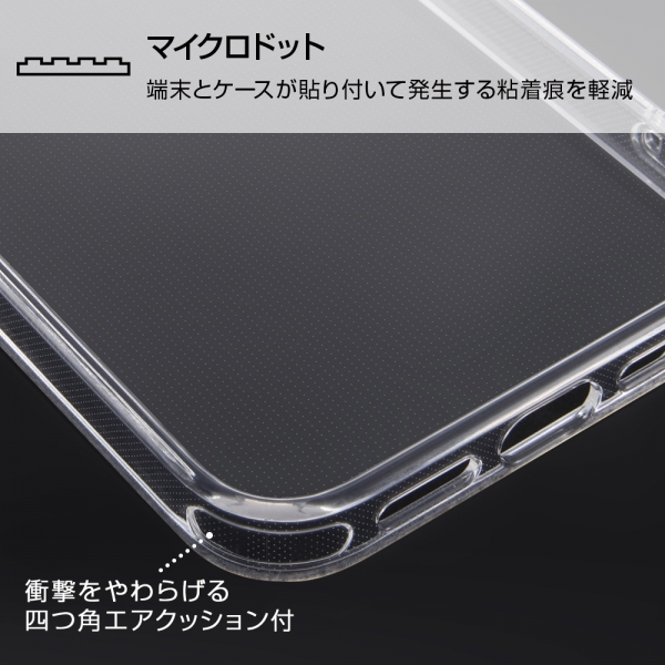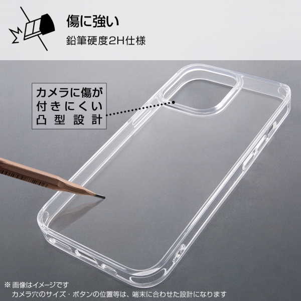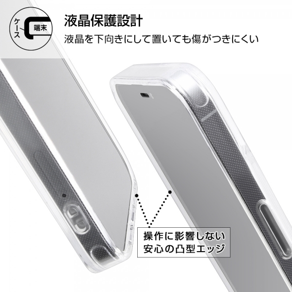 衝撃吸収性のあるTPU×摩擦によるキズを低減するポリカーボネイト。カメラに傷が付きにくい凸型設計。鉛筆硬度2Hで傷に強い。衝撃をやわらげる柔らか素材×四つ角エアクッション。マイクロドット加工で背面の粘着痕を軽減。