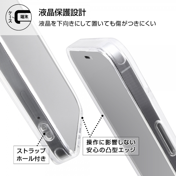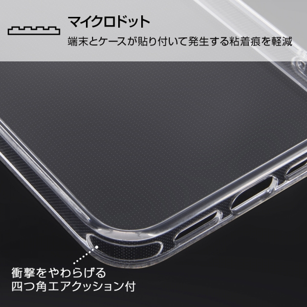 キャラクターのワンポイントデザインと側面のカラーがアクセント。カメラに傷が付きにくい凸型設計。鉛筆硬度2Hで傷に強い。衝撃をやわらげる柔らか素材×四つ角エアクッション。マイクロドット加工で背面の粘着痕を軽減。