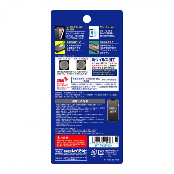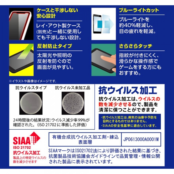 目の疲れを軽減/反射防止タイプ。レイ・アウト製ケース(別売)と一緒に使用しても干渉しない設計。ブルーライトを約40%軽減し、目の疲れを軽減。太陽光や照明の反射を防ぐので画面が見やすい。ウイルスの数を減少させ、製品を清潔に保つことができます。SIAAの安全性基準に適合。